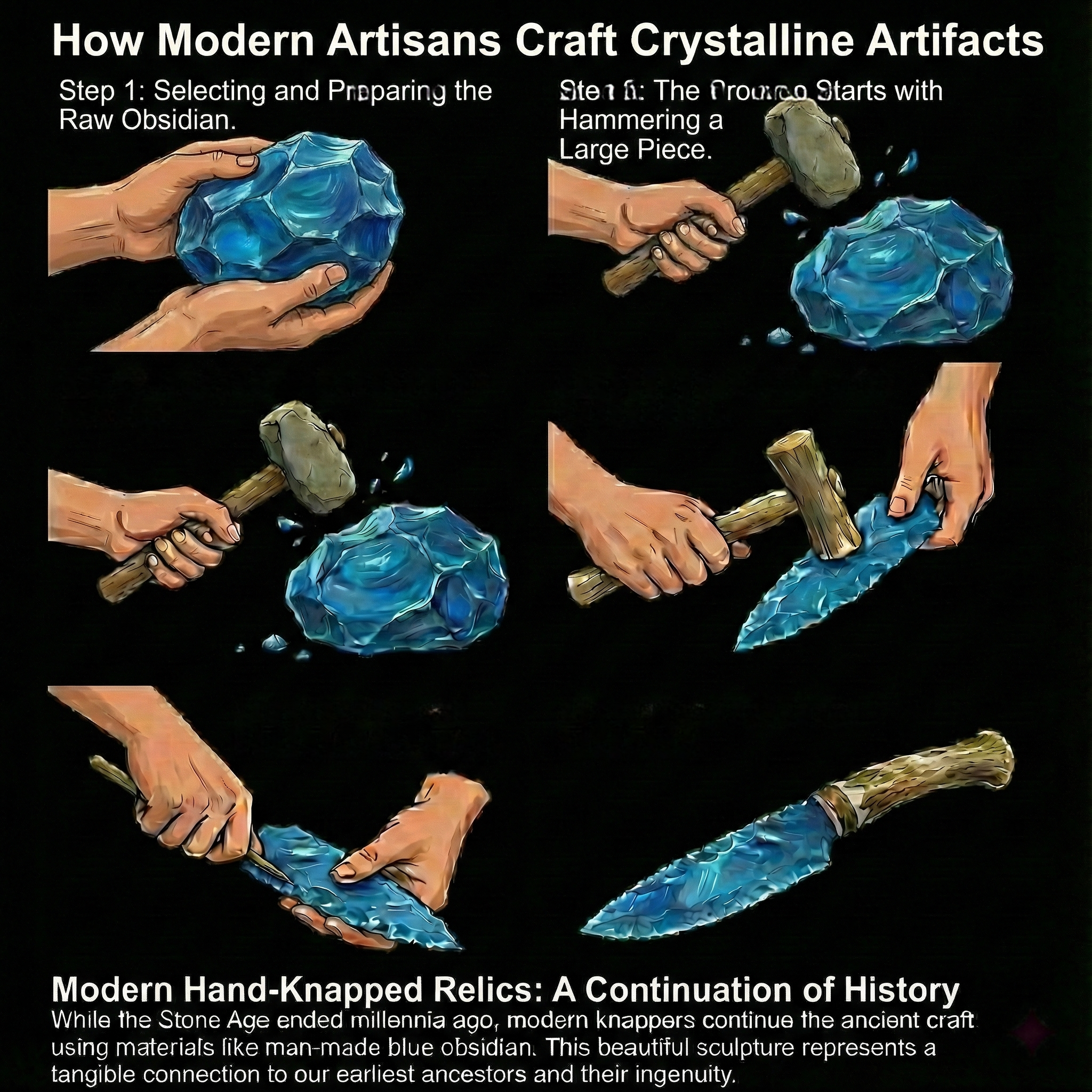 • What are these artifacts made of? Our pieces are handcrafted from Artisan Knapped Glass, utilizing fiber optic materials, obsidian-style glass, or volcanic glass. We use ancient flintknapping techniques to create the unique "conchoidal" fractures that catch the light.