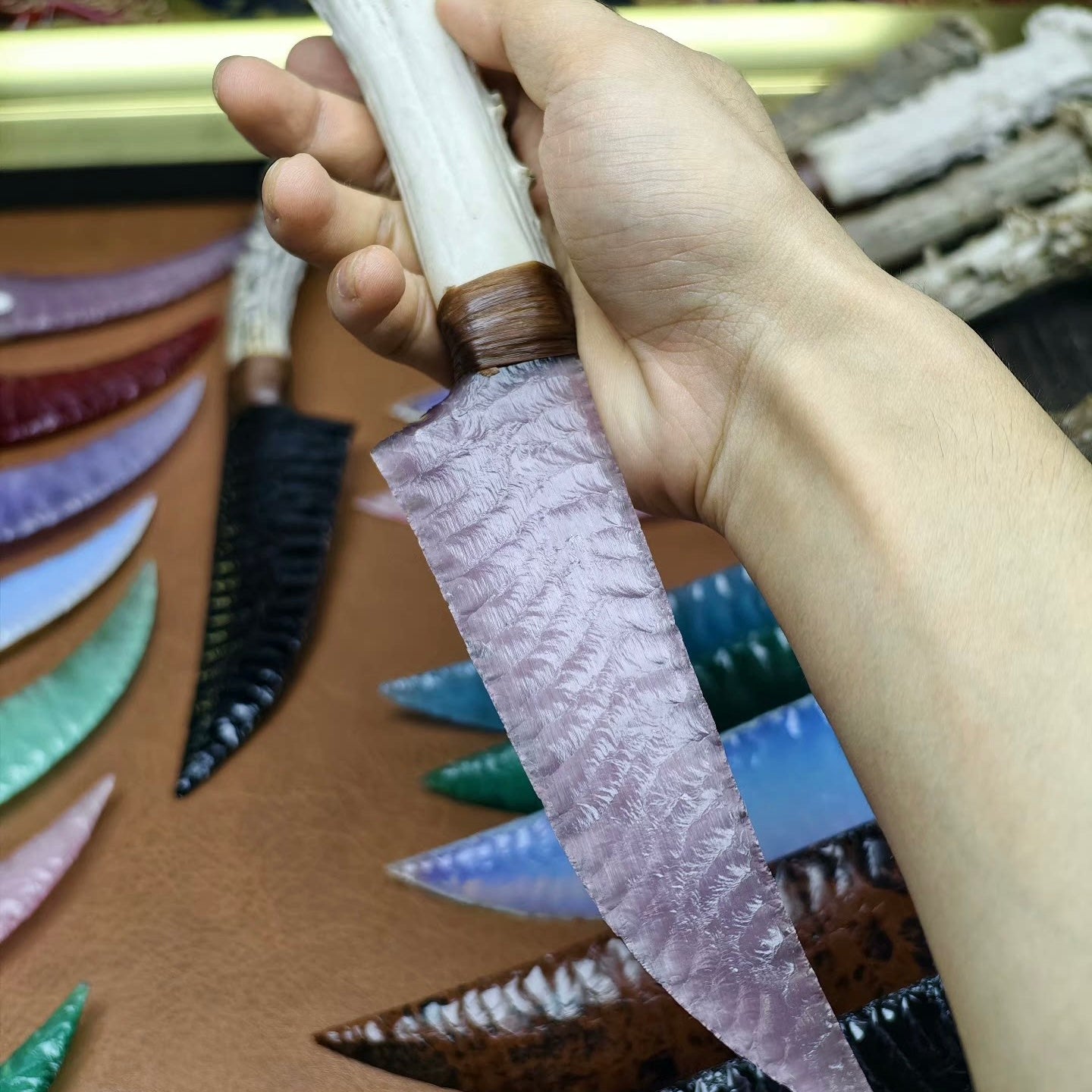 • Ancient & Alien: The juxtaposition is stunning—the raw, earthly Genuine Stag Antler handle holding a blade that looks like it came from another dimension. It feels like a relic found in a wizard's tower.